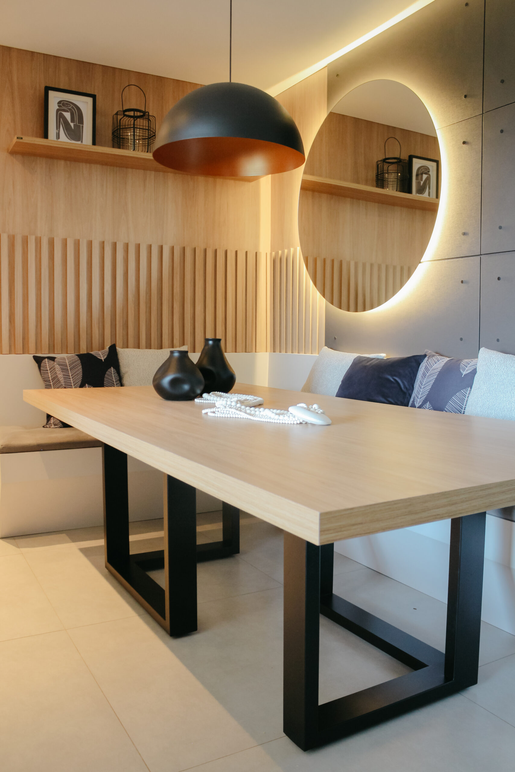 Cada ambiente foi pensado para garantir uma atmosfera harmônica e leve, equilibrando os contrastes entre os elementos urbanos e naturais. O uso de madeira traz calor e acolhimento, suavizando a imponência dos metais e criando uma sensação de conforto, essencial para um lar. As tonalidades de cinza foram escolhidas para criar uma base neutra, enquanto os metais pretos adicionam sofisticação e modernidade.