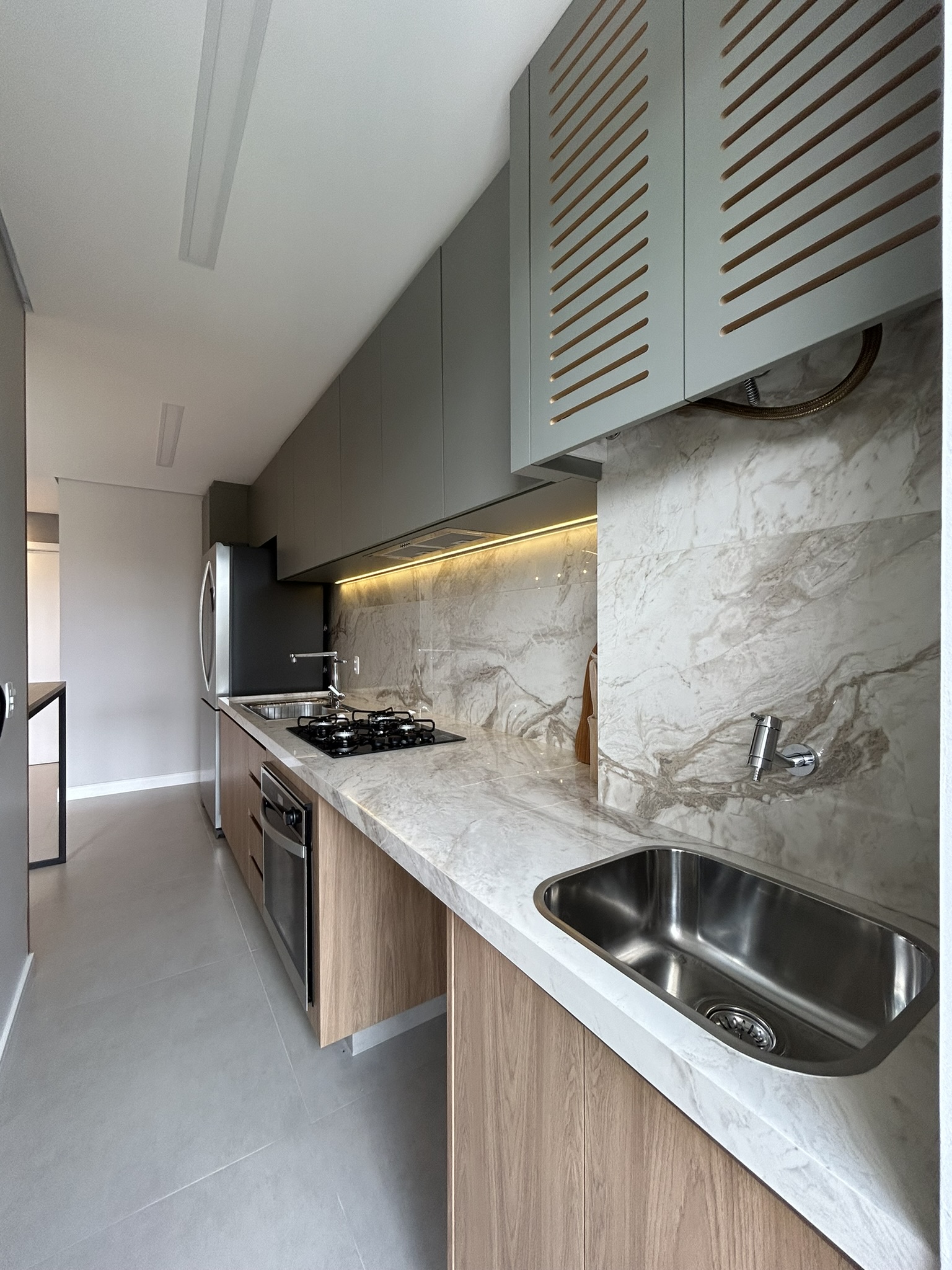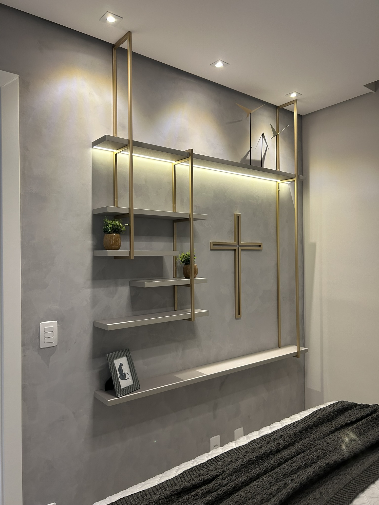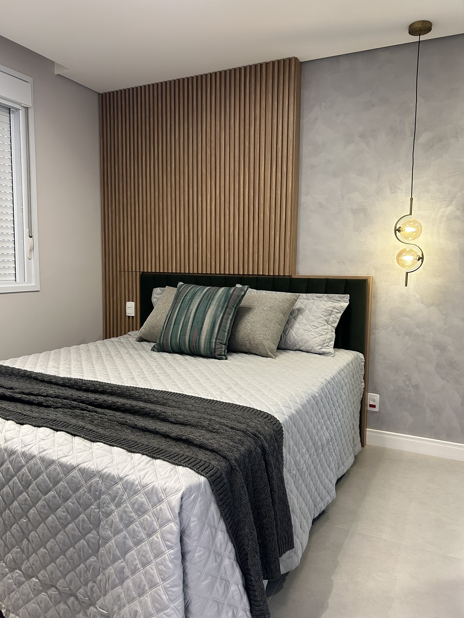 Este projeto é uma verdadeira celebração da elegância e do aconchego, onde cada detalhe foi cuidadosamente pensado para refletir a personalidade dos clientes. O revestimento marmorizado, que se destaca na cozinha, confere sofisticação e imponência ao ambiente, enquanto a marcenaria verde, longe do convencional, traz um toque moderno e único. O uso de elementos amadeirados cria uma atmosfera acolhedora e natural, proporcionando conforto em todos os cantos do lar. Na suíte, a personalidade dos clientes é sutilmente estampada em um altar religioso, que se integra ao ambiente com respeito e harmonia, criando um espaço de reflexão e tranquilidade. O equilíbrio entre materiais, cores e texturas torna este projeto não apenas bonito, mas também cheio de significado, criando um espaço onde cada elemento tem uma história e propósito